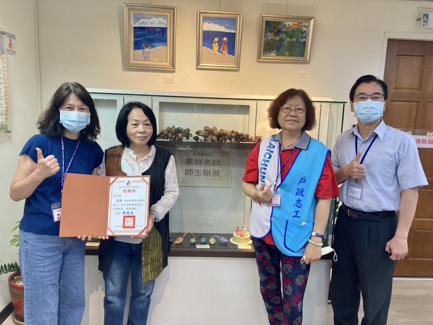 高鮮老師臺中市北區長青學苑教學第14年,台中師範學院美勞組畢業、東海大學美術系碩士畢業,服務台中市國民小學教師30年,台中市犁頭店社大手工藝教師、台中市曉明長青樂齡示範中心手工藝教師、學校或社團創意藝術教師。曾於全省文化中心、美術館舉辦油畫創作個展十次。併參加全臺藝文聯展數十次,深獲好評。有感於台灣人口老化嚴重,希望帶動年長者手腦靈活運用,促進身心健康。藉由此次藝文展覽讓長者所創作的各種創意作品展現人前,除了提升辦公環境的藝術氣息,也讓更多作品廣為人知。