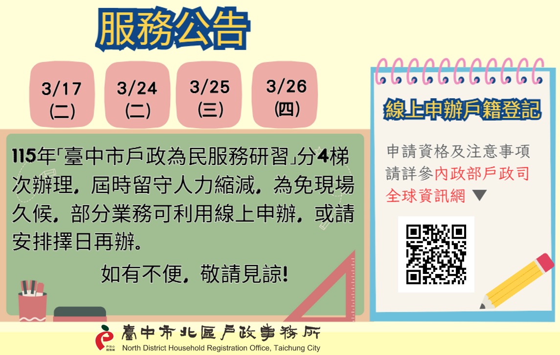 本所於3/17(二)、3/24(二)、3/25(三)及3/26(四)分4梯次參加「115年臺中市戶政為民服務研習」,屆時留守人力緊縮,為免現場久候,部分業務可利用內政部戶政司線上申辦戶籍登記服務或請安排擇日再辦。